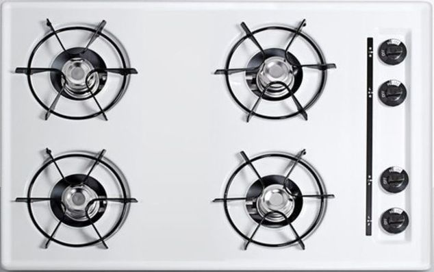 Four open 9000 BTU burners include built-in enamel grates. This unit comes set for natural gas but can be converted to propane with the purchase of the Kit LP accessory. It utilizes battery start ignition with a standard 9V battery (included) to allow the cooktop to function in homes not using electricity.